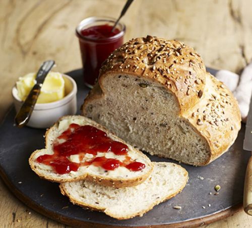 Heat the butter, honey and 300ml water in a saucepan. Set aside to cool to hand temperature. Mix the flours,